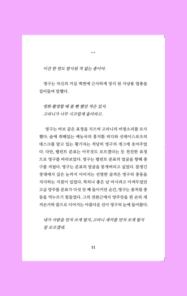 당대 최고의 슬랩스틱 코미디언이 북한산의 경고를 받으며 벌어지는 미스터리 <영구 없다> (조현철), 잃어버린 신체를 찾아 멸망한 지구를 횡단하는 내용의 <떠돌이 안드로이드> (최아름), 훔친 차 트렁크에서 죽어가는 여자를 발견한 도둑이 털어놓는 믿을 수 없는 하룻밤 이야기 <차를 훔쳤을 뿐인데> (성다솜), 전쟁의 승리를 위해 계백의 곁으로 숨어든 화랑 관창과 그를 향한 욕망을 다룬 <계백과 관창, 근데 이제 사랑을 곁들인> (신이수). 다양한 장르, 어디에서도 보지못한 기묘한 이야기, 강렬한 묘사와 예상치 못한 결말이 모두 담겨있다.